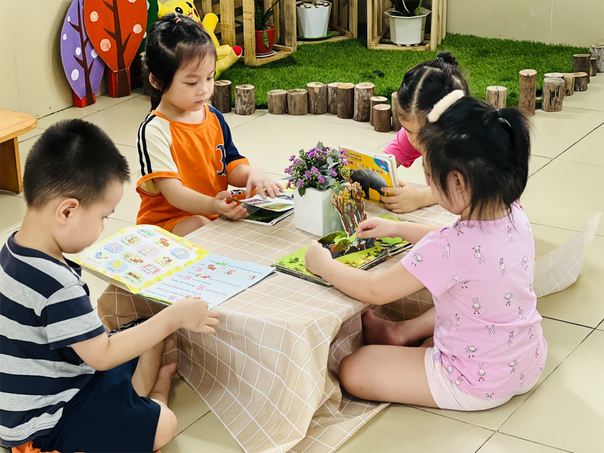 Trẻ tham gia vào các góc chơi ở lớp như: Góc kỹ năng, góc nghệ thuật (Âm nhạc - Tạo hình); góc làm quen với toán; góc sách truyện, góc bác sĩ, góc bán hàng, góc xây dựng…Ở mỗi góc chơi trẻ đều được học những kiến thức, kỹ năng khác nhau và quan trọng hơn cả là trẻ có cơ hội được thể hiện mình và biết phối hợp cùng các bạn tham gia các hoạt động.