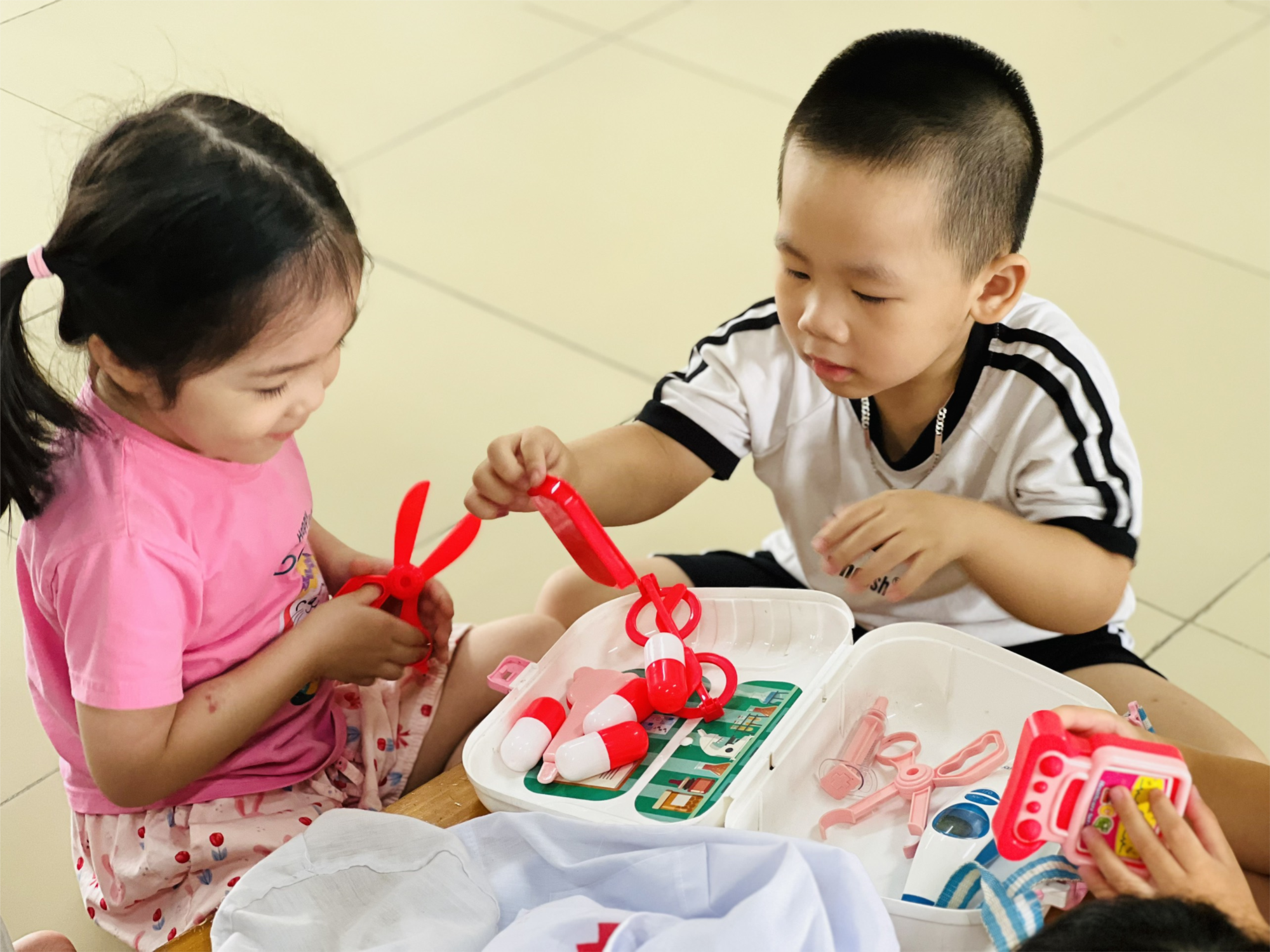 Sau đây là 1 số hình ảnh tiết học khám phá các đồ dùng, dụng cụ nghề bác sĩ của lớp MGB C2: