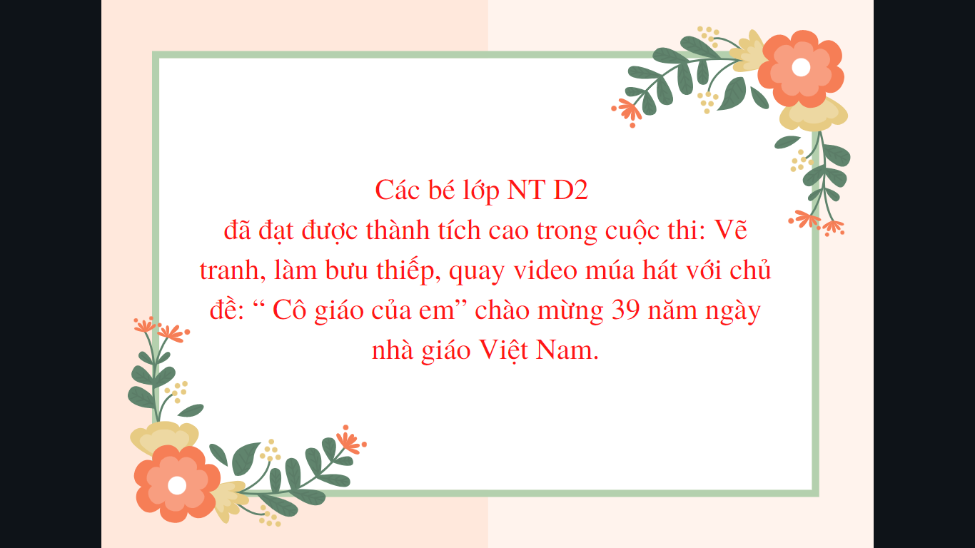 Và đây là những thành quả của các bé lớp NT D2 đã đạt được trong cuộc thi: Vẽ tranh, làm bưu thiếp, quay video múa hát với chủ đề: “ Cô giáo của em” chào mừng 39 năm ngày nhà giáo Việt Nam. Xin mời, các bố mẹ và các bạn cùng xem các bạn nhỏ lớp NT D2 đã đạt được những thành tích như thế nào nhé!