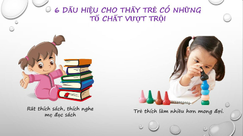 Tại Hội nghị Khoa học thường niên được tổ chức bởi Viện Nghiên cứu Phát triển đặc biệt (ISAD) mới đây, tiến sĩ Linda Silverman (Giám đốc Trung tâm Nghiên cứu Thiên tài Denver ở Canada) đã đề cập đến 6 dấu hiệu sớm của trẻ giai đoạn trước 6 tuổi có thể liên quan đến tố chất lãnh đạo, khôn khéo và trí tuệ vượt trội. 6 dấu hiệu đó là: