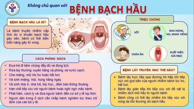 •Cần tuyên truyền giáo dục sức khỏe thường xuyên về bệnh, tìm hiểu cơ bản các thông tin liên quan đến bệnh bạch hầu như triệu chứng, cách phòng bệnh, tiêm vắc-xin phòng bạch hầu, điều trị hiệu quả...