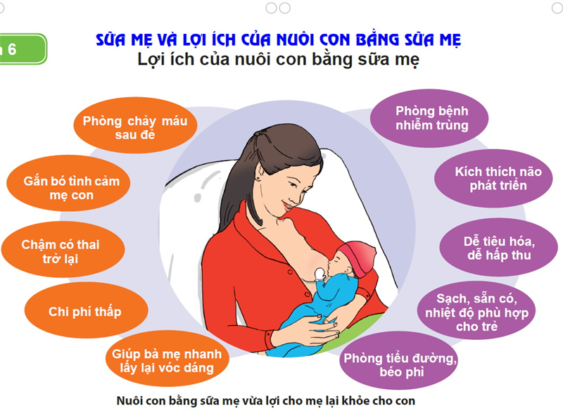 - Sữa mẹ là nguồn thức ăn tự nhiên tốt nhất cho trẻ. Trong sữa mẹ có đầy đủ các thành phần dinh dưỡng với tỷ lệ cân đối phù hợp với hệ tiêu hóa và hấp thụ của trẻ. Sữa mẹ còn có kháng thể giúp trẻ tăng cường sức đề kháng chống lại các bệnh nhiễm trùng. Việc nuôi con bằng sữa mẹ sẽ giảm nguy cơ thiếu dinh dưỡng (suy dinh dưỡng) hoặc thừa dinh dưỡng (thừa cân/béo phì), các bệnh mãn tính không lây khi trưởng thành, đặc biệt là bệnh lý tim mạch, tăng huyết áp, đái tháo đường,...