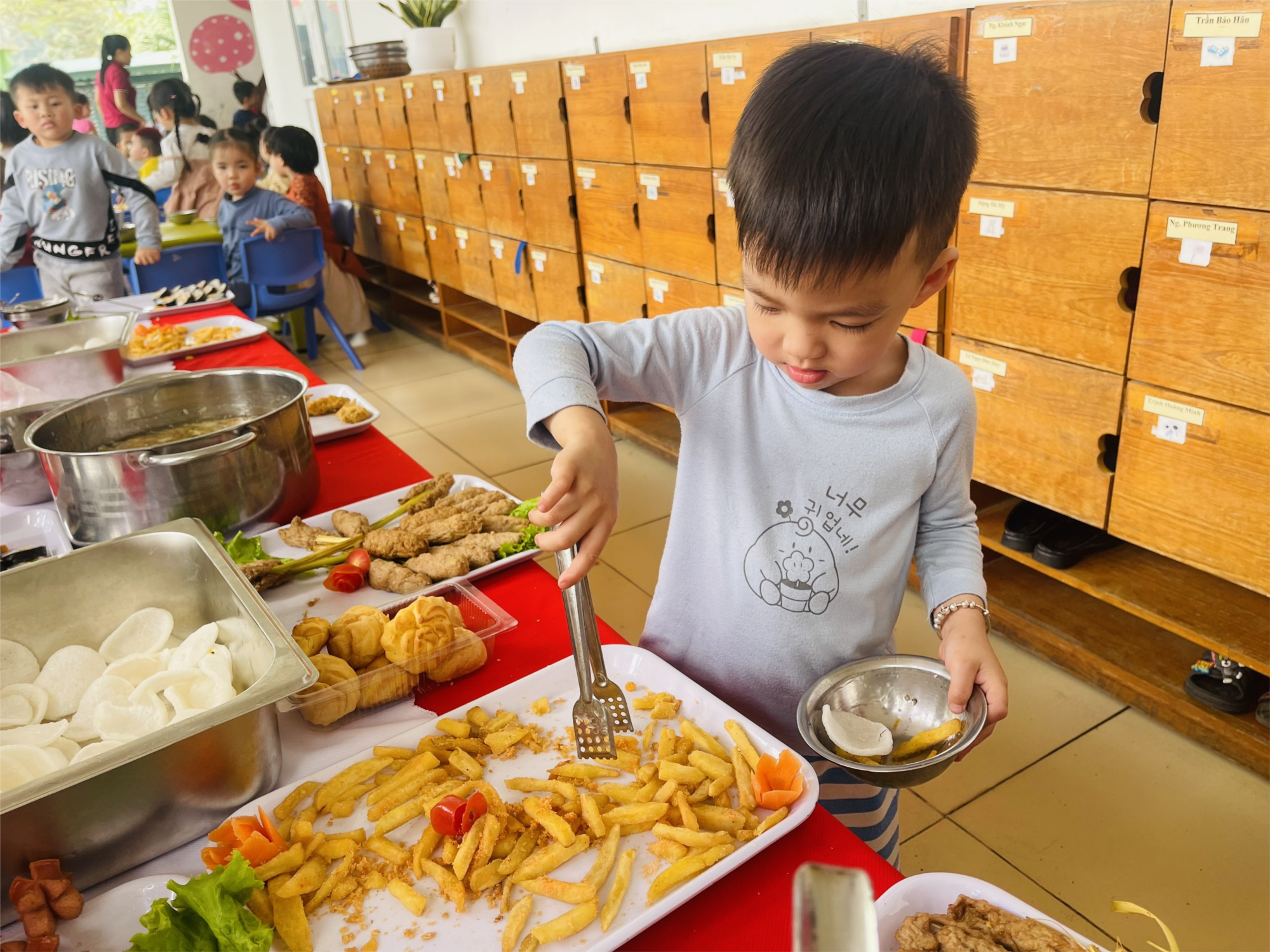 Các món ăn trong bữa tiệc hôm nay đã được nhân viên, giáo viên trong trường, cùng sự hỗ trợ các đại diện phụ huynh đã tạo nên các món ăn hấp dẫn, trang trí và bày biện trông rất đẹp mắt. Tiệc Buffet là một trải nghiệm thú vị và hữu ích đối với các bé. Đây là dịp để các bé trải nghiệm hình thức ăn uống hiện đại để qua đó các bé có thể tự tin hơn, có được sự thoải mái hơn khi tham gia các bữa tiệc tương tự ở các không gian khác nhau.