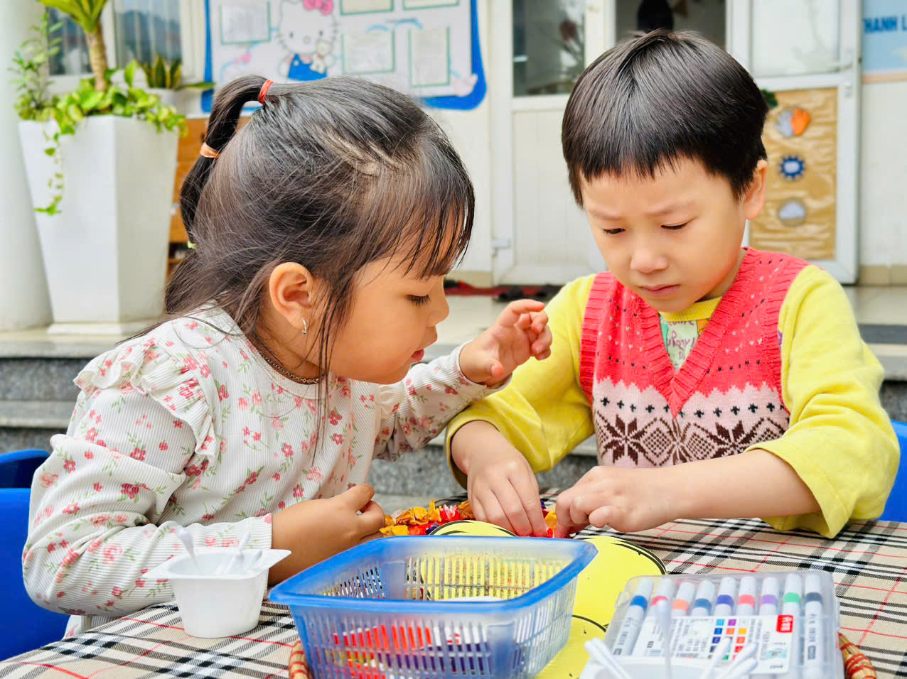 Dưới sự hướng dẫn của cô giáo, các bé được làm quen với nhiều nguyên vật liệu như giấy màu, keo dán, bút màu, hoa trang trí... Mỗi bé đều tự do sáng tạo, trang trí thiệp theo sở thích của mình. Những đôi bàn tay nhỏ nhắn cẩn thận tô vẽ, cắt dán từng chi tiết, tạo nên những tấm thiệp rực rỡ và đầy yêu thương.