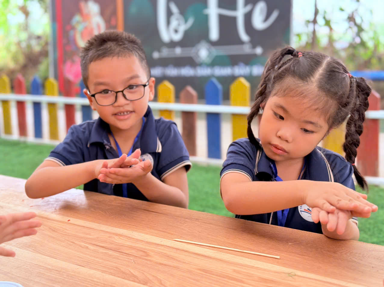 Điều đặc biệt trong hoạt động lần này là mỗi bé đều làm tò he để tặng bạn – một hành động nhỏ nhưng chứa đựng thông điệp yêu thương và sẻ chia. Các bé vô cùng hào hứng khi trao món quà do chính tay mình làm ra cho bạn bên cạnh, kèm theo những lời chúc dễ thương và ánh mắt lấp lánh niềm vui.