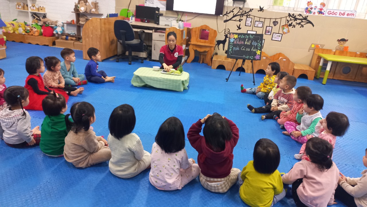 Với tiết nhận biết tập nói, đề tài “Củ xu hào”: Cô lựa chọn một số từ cần cung cấp và cho trẻ được nói nhiều để phát triển ngôn ngữ, chuẩn bị thêm đồ dùng trực quan là những loại củ quả thật để cho các con được quan sát, điều này đã gây sự hứng thú và kích thích ngôn ngữ ở trẻ. Trẻ được quan sát, tìm hiểu về củ xu hào. Bạn nào cũng hứng thú khi được quan sát, được sờ trực tiếp vào các củ xu hào. Trẻ biết được củ xu hào là một loại rau củ, dùng để ăn. Bạn nào cũng phấn khởi, háo hức, tò mò. Cuối giờ học trẻ được chơi các trò chơi phân biệt các loại rau ăn lá, rau ăn củ. Buổi học kết thúc trong bầu không khí vui tươi, háo hức mong chờ những buổi học tiếp theo.