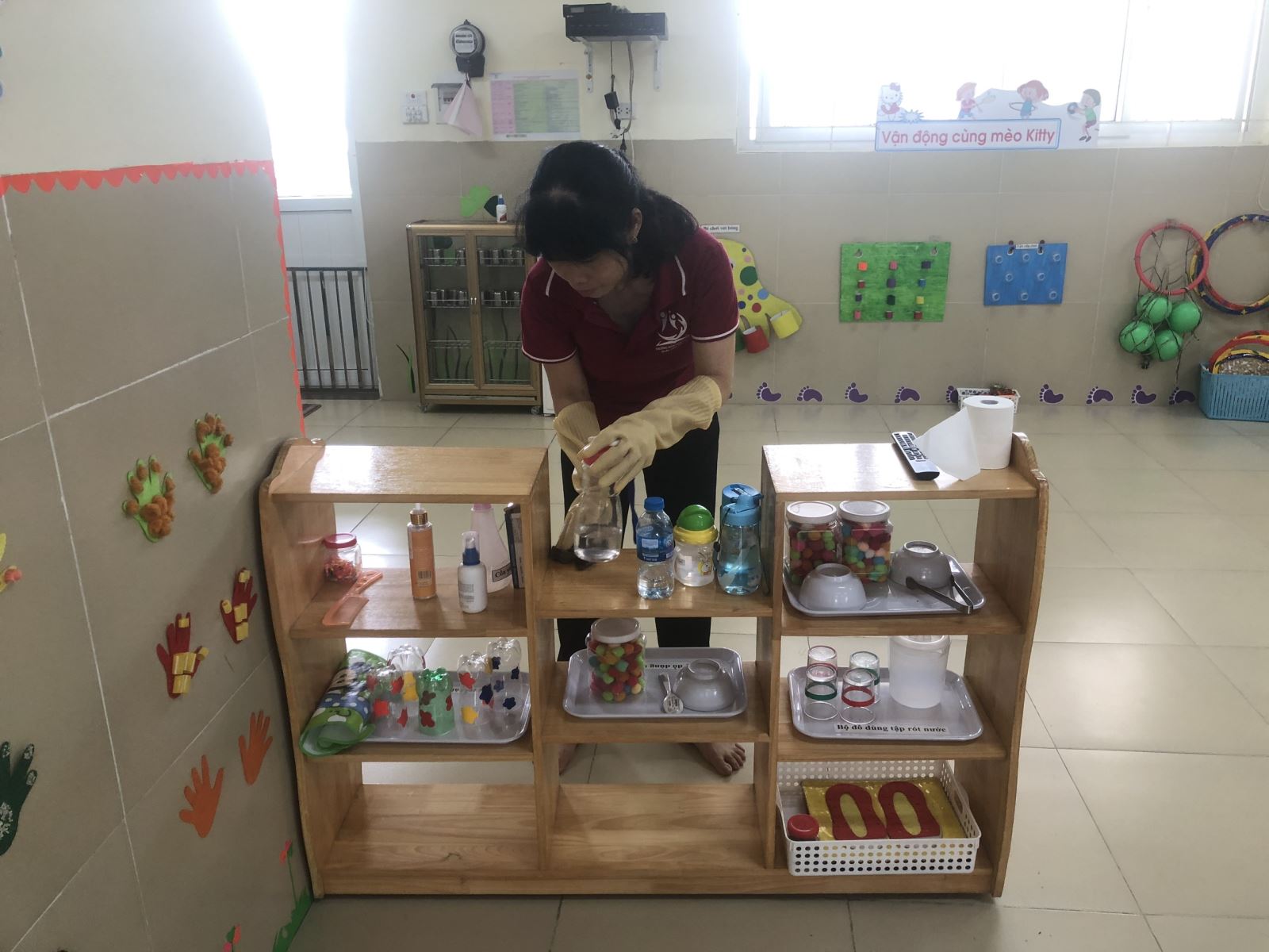 Mùa hè là mùa của các bệnh như tay chân miệng, bạch hầu…nên trẻ nhỏ rất dễ mắc bệnh. Để tránh mắc bệnh cho trẻ và để có một môi trường sạch sẽ gọn gàng, tạo cho trẻ một không gian chơi thoáng mát, lớp D1 hàng tuần vẫn thường xuyên duy trì tổng vệ sinh lớp học. Giáo viên bố trí sắp xếp các góc, phân loại các đồ chơi hỏng, lau chùi từng giá góc, lau xung quanh các cánh cửa tay cầm… Đồng thời giáo viên cũng ngâm tẩy rửa đồ chơi bằng Cloramin B. Các cô hy vọng trẻ đến trường được vui chơi và khỏe mạnh.