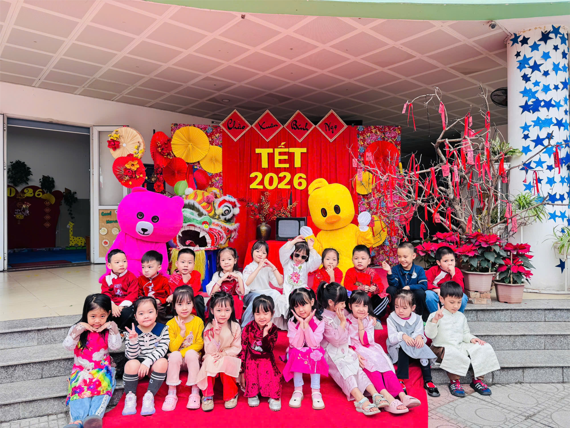 Ngay từ sáng sớm, cô giáo đã ân cần đón trẻ với những nụ cười thân thương và lời chúc đầu năm đầy yêu thương. Các bé đến lớp trong trang phục áo dài, gương mặt rạng rỡ, lễ phép chào cô, chào bạn và hào hứng kể cho nhau nghe về những ngày Tết sum vầy bên gia đình.