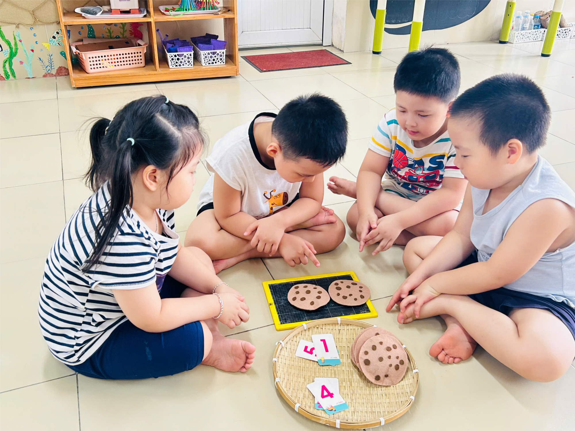 Thông qua hoạt động này, các con không chỉ củng cố kiến thức về số 5, mà còn rèn luyện sự tập trung, tính kiên nhẫn và khả năng quan sát. Những ánh mắt chăm chú, bàn tay nhỏ xinh cẩn thận xếp từng chiếc bánh, ghép từng con số đã cho thấy sự say mê học tập của các bé.