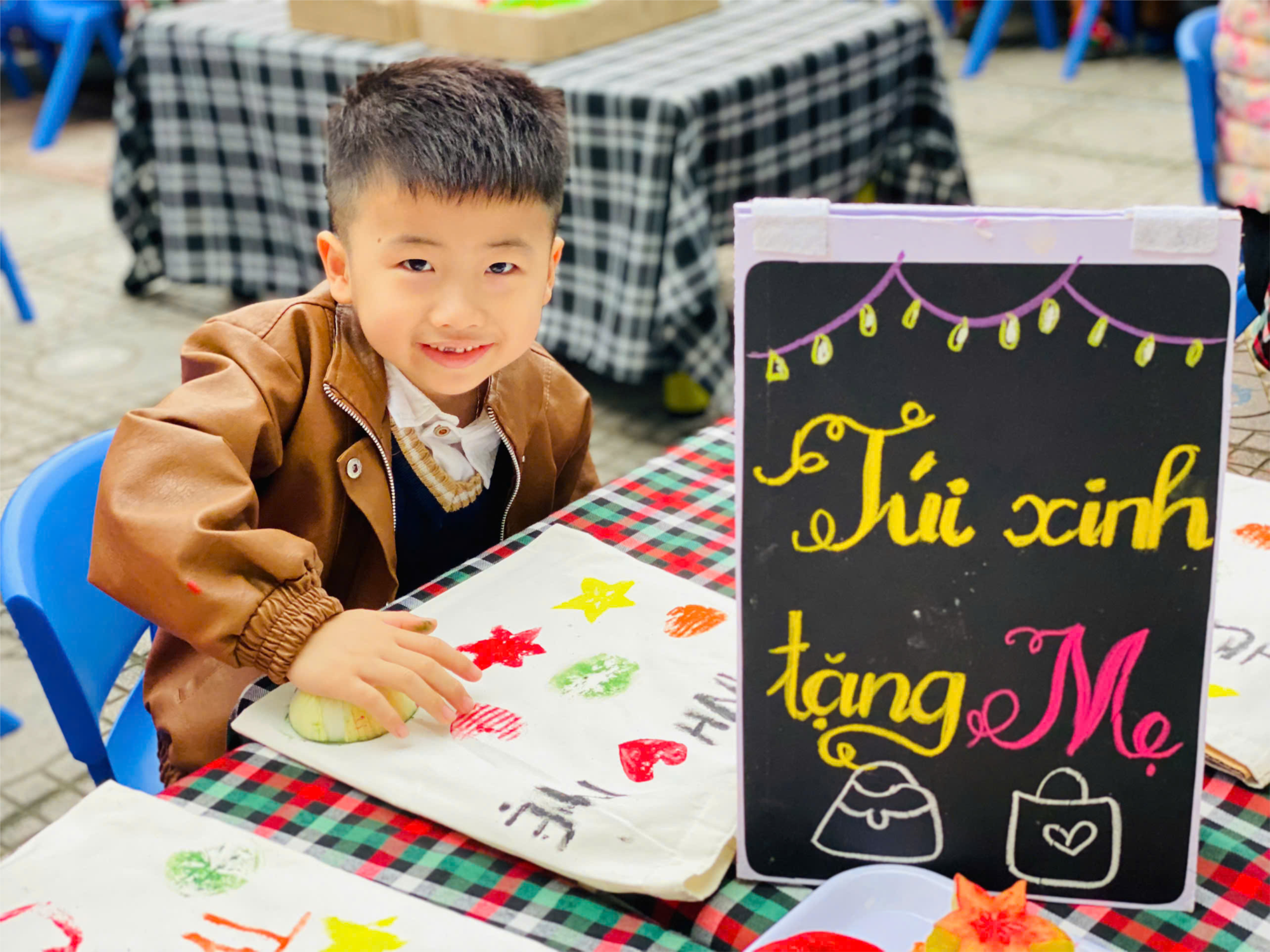 Dưới sự hướng dẫn tận tình của các cô giáo, các bé đã được trải nghiệm nhiều công đoạn thú vị như chọn túi vải, trang trí bằng cách in màu và viết những lời chúc dễ thương. Những đôi bàn tay nhỏ nhắn đã tỉ mỉ sáng tạo nên những chiếc túi đầy màu sắc, mang đậm dấu ấn cá nhân của từng bé.