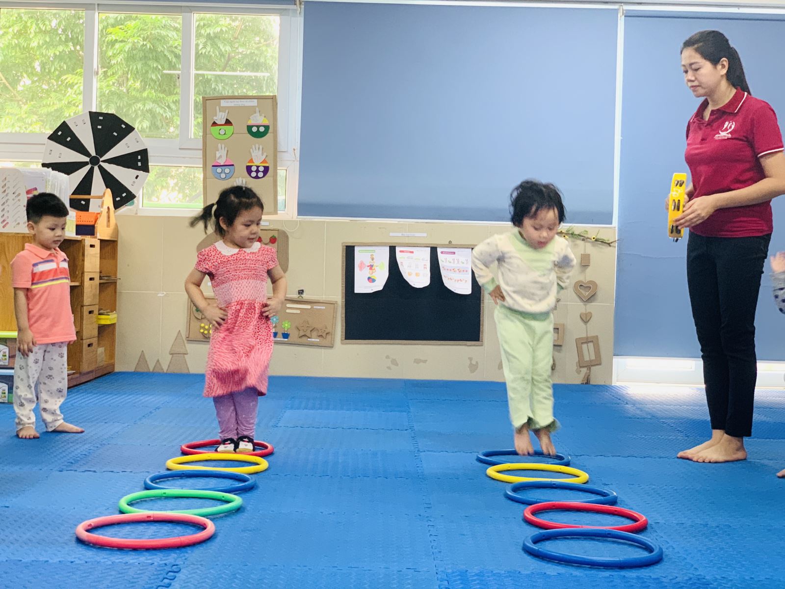 Mỗi ngà !important;y đến lớp, các bé lớp mẫu giáo bé C2 được học rất nhiều bài học hay. Với mục đích rèn cho trẻ mẫu giáo bé kỹ năng "Bật về phía trước 3-4 lần" lớp MGB C2 đã tổ chức một giờ học thể chất bổ ích để qua đó phát triển tổ chất nhanh nhẹn, khéo léo cho các con.