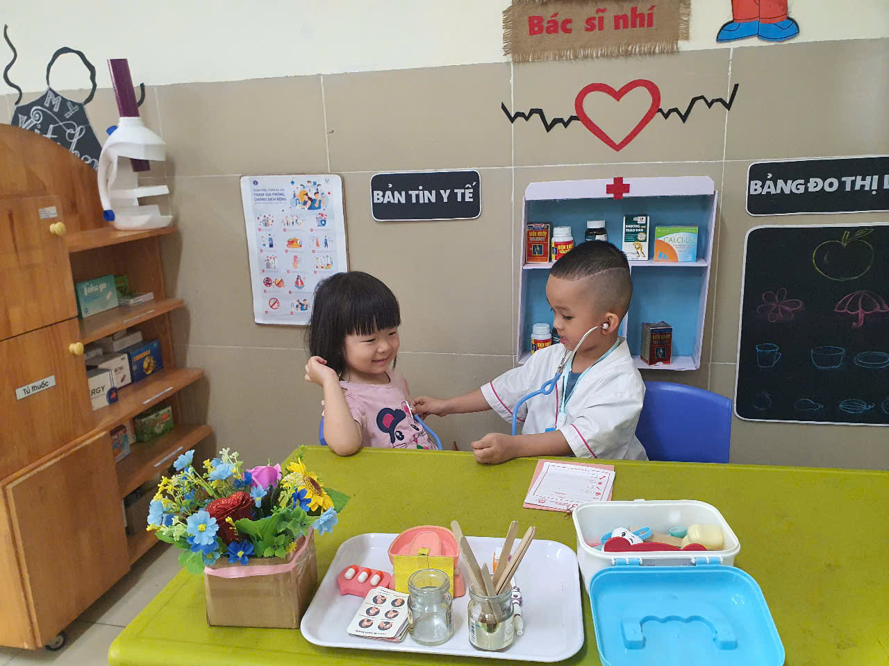 Tại góc xây dựng, các bé cùng nhau xếp gạch, dựng nhà, xây hàng rào bằng các khối gạch với sự phối hợp nhịp nhàng và tinh thần đồng đội. Nhiều công trình “kiến trúc mini” đã ra đời như, mô hình Lăng Bác, khu vườn hoa, khu vui chơi, hồ sen dưới bàn tay khéo léo của các “kỹ sư nhí”. Góc bác sĩ thu hút các bé hóa thân thành bác sĩ, y tá tận tình khám bệnh, đo nhiệt độ và tiêm thuốc cho bệnh nhân. Qua đó, trẻ học được cách chăm sóc người khác và biết giữ gìn sức khỏe. Ở góc bán hàng, không khí trở nên rộn ràng khi các bé đóng vai người bán và người mua với các mặt hàng như rau củ, bánh kẹo, sữa… Trẻ học cách trao đổi, tính toán đơn giản và xếp hàng chờ đến lượt. Góc nấu ăn cũng rất sôi động với những món ăn “ngon mắt” do chính tay các bé chế biến từ đồ chơi mô hình. Bé nào cũng say mê làm đầu bếp, nấu ăn và mời bạn cùng thưởng thức.