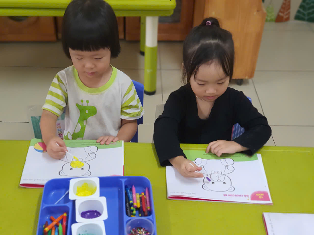 Với chủ đề: "Đồ chơi trong lớp học của bé", cô giáo đã cho trẻ thực hiện bài tạo hình: "Tô màu đồ chơi của bé". Mặc dù các bé vừa từ lứa tuổi nhà trẻ lên, nhưng rất nhiều bé đac có kỹ năng cầm bút, tô màu tốt.