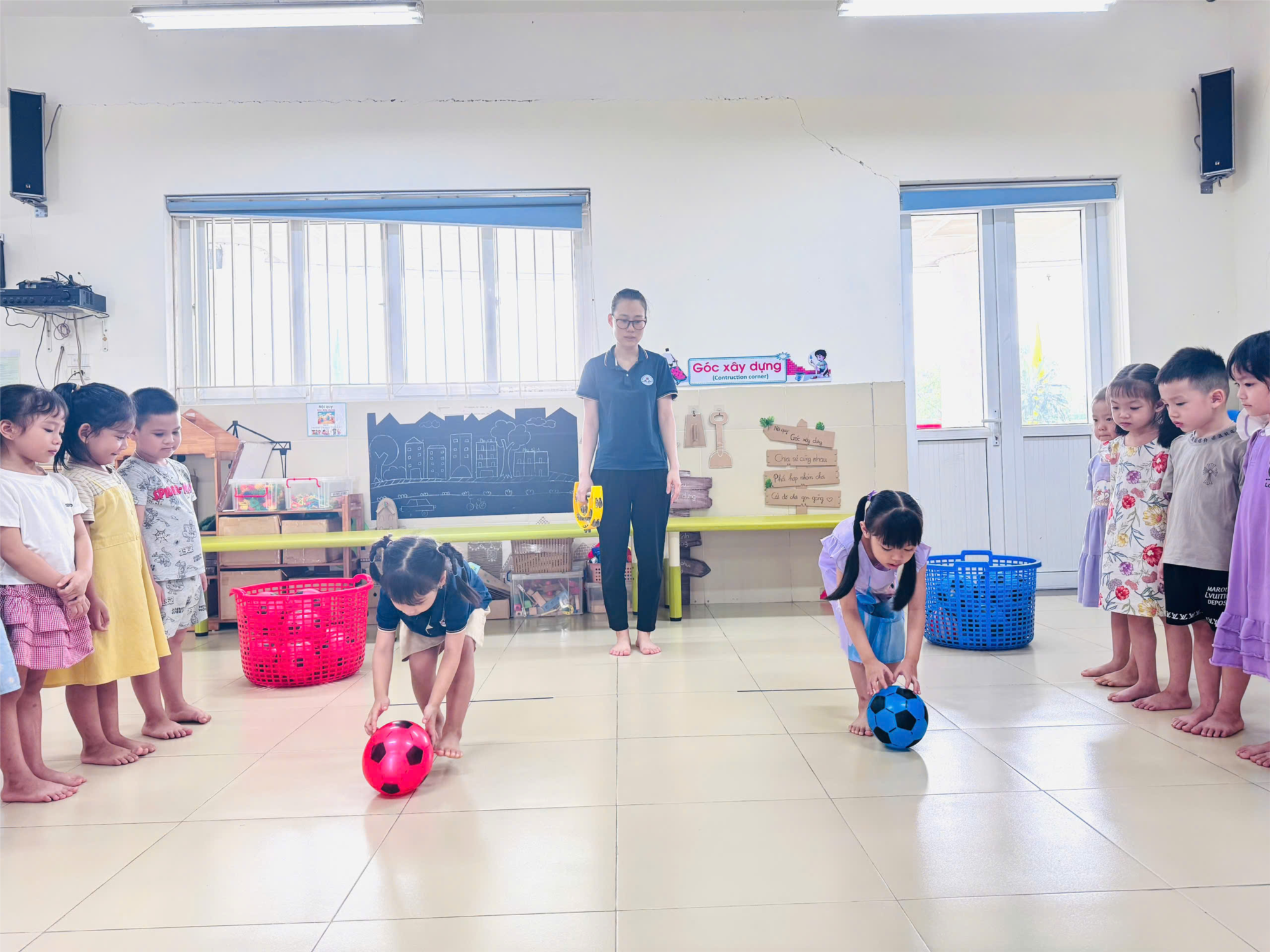 Trong tiết học, các bé được tham gia trò chơi “Lăn bóng và di chuyển theo bóng”. Với tinh thần hào hứng, các con đã cùng nhau thực hiện những động tác khéo léo, nhanh nhẹn, vừa vận động vừa phối hợp nhịp nhàng với bạn bè. Hoạt động không chỉ mang lại niềm vui, tiếng cười cho các bé mà còn góp phần rèn luyện sự dẻo dai, khả năng tập trung và tinh thần đoàn kết trong tập thể.