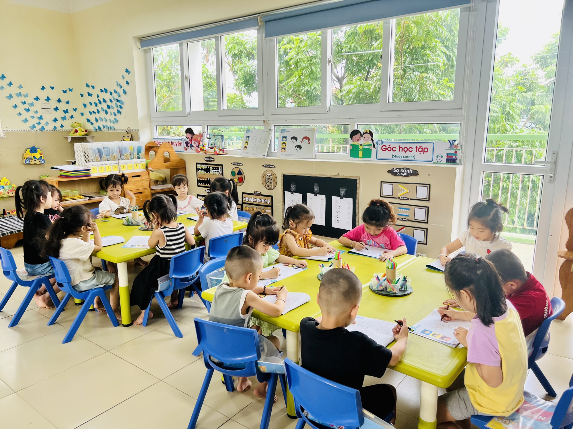 Hoạt động tạo hình là một trong những hoạt động vô cùng hấp dẫn đối với trẻ mẫu giáo, nó giúp trẻ tìm hiểu thêm và khám phá một cách sinh động những gì mà trẻ nhìn thấy trong thế giới xung quanh, trẻ dễ bị lôi cuốn trước những cảnh vật có nhiều màu sắc, hay một bức tranh sống động. Hoạt động tạo hình của trẻ trong trường mẫu giáo chính là một phương tiện phát triển thẩm mỹ cho trẻ, để hình thành ở trẻ những cơ sở ban đầu về hoạt động học tập, trong các hoạt động vẽ, nặn, xé, dán......giúp trẻ phát triển các chức năng tâm lý, và khả năng tri giác các sự vật hiện tượng xung quanh, từ đó phát triển tư duy và quá trình đó làm phát triển trí tưởng tượng và ham muốn tạo ra cái đẹp, sẽ góp phần không nhỏ vào việc nâng cao chất lượng giáo dục trong nhà trường đối với từng nhóm lớp. Dưới đây là một vài hình ảnh giờ học: Tô màu đồ chơi của bé của các bạn nhỏ lớp MGN B1.