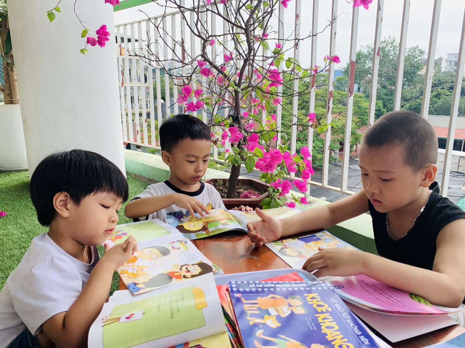 Trong thời gian các con sinh hoạt tại trường, ngoài những giờ hoạt động có chủ đích, giờ vui chơi, giáo viên chúng tôi luôn dành cho trẻ những khoảng thời gian để trẻ được xem sách truyện. Khi giáo viên cho trẻ thay đổi môi trường ngoài lớp học, trẻ vừa xem sách, truyện, vừa hòa mình cùng với thiên nhiên, đem lại một cảm giác thật thú vị.