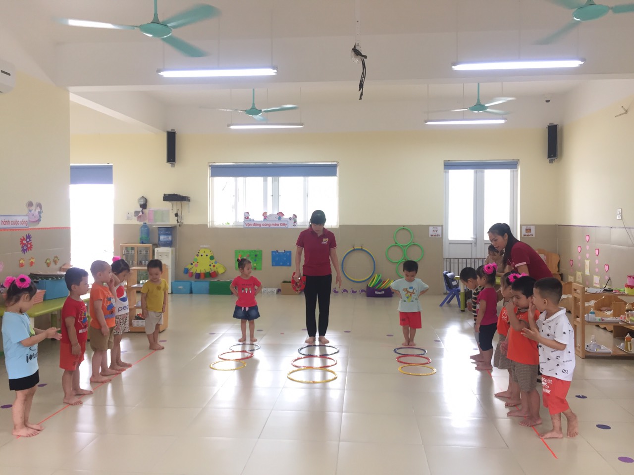 Để đáp ứng điều đó, với sự tổ chức và hướng dẫn của các cô, các bé lớp nhà trẻ D1 đã cùng nhau tham gia hoạt động thể chất với bài tập: Bật liên tiếp qua các vòng.Thông qua tiết học trẻ biết thực hiện vận động dùng lực của chân bật liên tiếp qua các vòng và tiếp đất bằng 2 bàn chân , người luôn giữ thăng bằng, đồng thời với sự khéo léo để không chạm vào vòng. Sau khi tập luyện các bé được tham gia chơi trò chơi “ Bóng tròn to” với niềm vui tươi phấn khởi. Sau đây là một số hình ảnh của trẻ khi tham gia hoạt động.