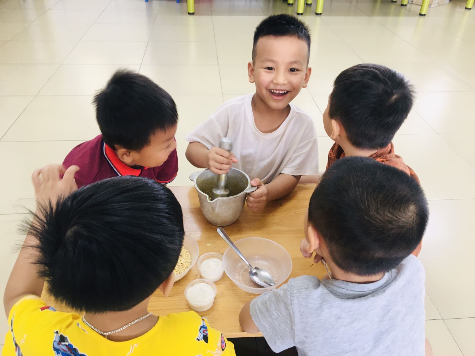 Đối với giờ học "Khám phá về củ lạc" của các bạn lớp mẫu giáo lớn, trẻ được tiếp cận về nhiều vấn đề cũng như khía cạnh xung quanh củ lạc. Trẻ cảm thấy vô cùng háo hứng và vui vẻ với hoạt động này. Trẻ được xem video về cách hình thành ra củ lạc, rồi làm sao lại có hạt lạc, trẻ được trải nghiệm hoạt động bóc lạc, bóc lạc sao cho dễ dàng và nhanh nhất, được giải thích tại sao lại có hạt lạc màu trắng, có hạt lạc màu đỏ, cách giã lạc làm vừng sao cho ngon, trộn muối với tỉ lệ như thế nào cho vừa để ăn không bị mặn hay nhạt quá, rồi bày, trang trí sản phẩm "cơm nắm muối vừng" của nhóm mình sao cho độc đáo nhất.