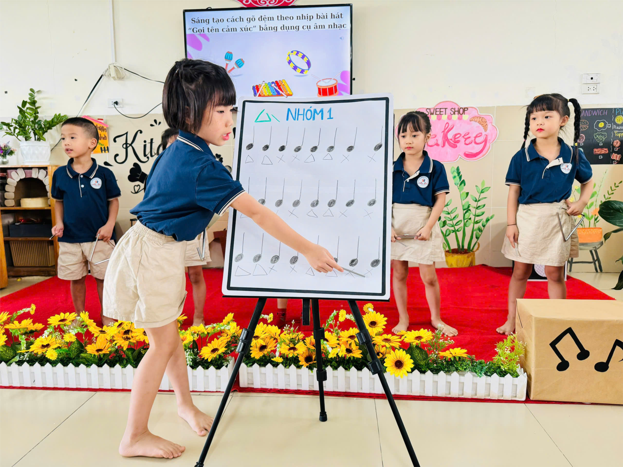 Sau đó, các bé được chia thành các nhóm nhỏ để thực hành gõ theo nhịp. Các dụng cụ như trống lắc, thanh gỗ đã được chuẩn bị sẵn, giúp các bé thể hiện sự sáng tạo và hứng thú khi hòa nhịp cùng giai điệu. Sự phối hợp nhịp nhàng giữa các nhóm tạo nên một bầu không khí vui tươi, sinh động. Qua các giai điệu quen thuộc, các bé không chỉ được học cách giữ nhịp, cảm thụ âm nhạc mà còn phát triển khả năng lắng nghe và hợp tác với bạn bè.