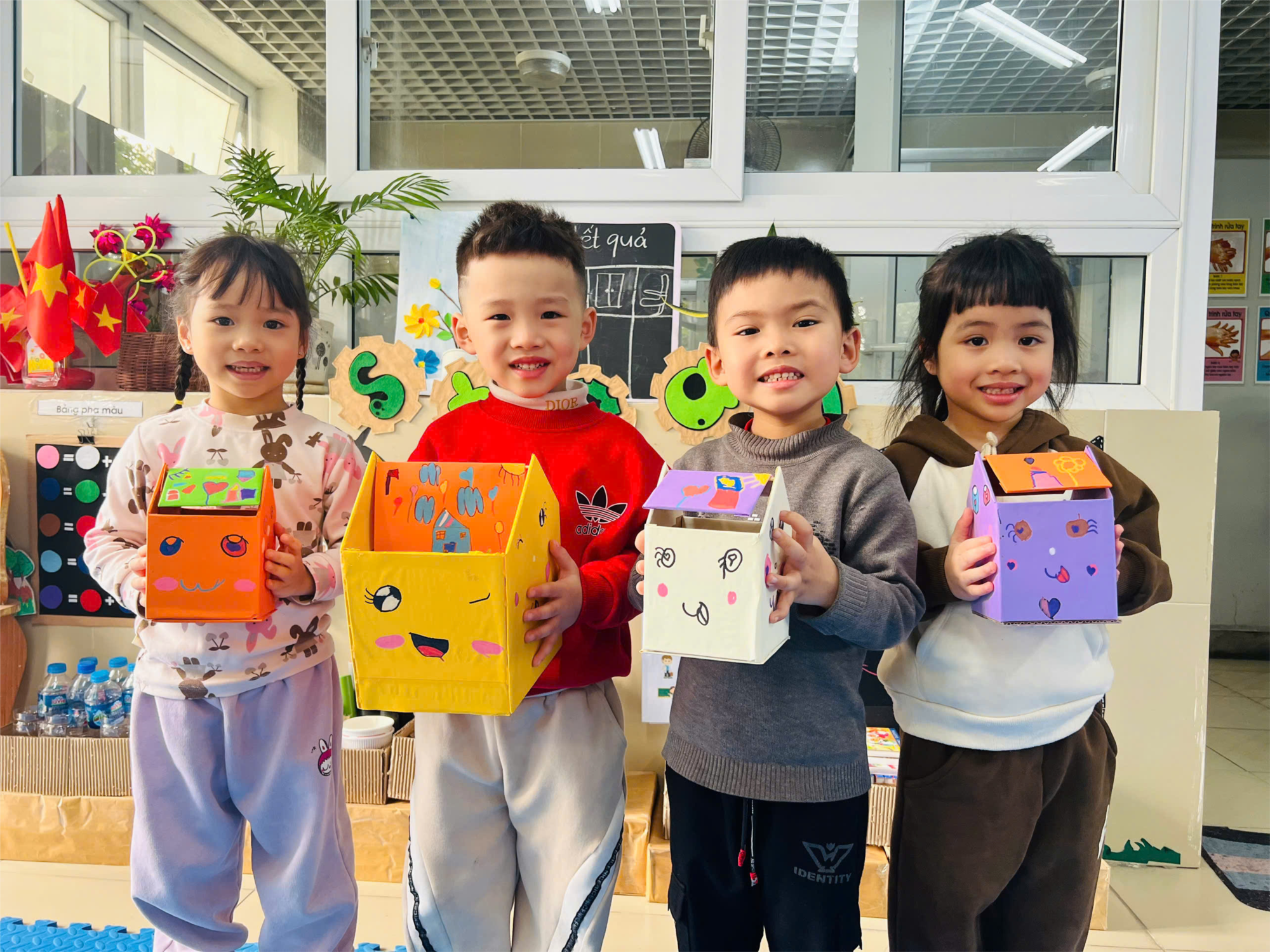 Hoạt động tạo hình này không chỉ giúp các bé phát triển khả năng tư duy sáng tạo mà còn giúp các em rèn luyện kỹ năng làm việc nhóm và học hỏi thêm về cách bảo vệ môi trường ngay từ những hành động nhỏ.