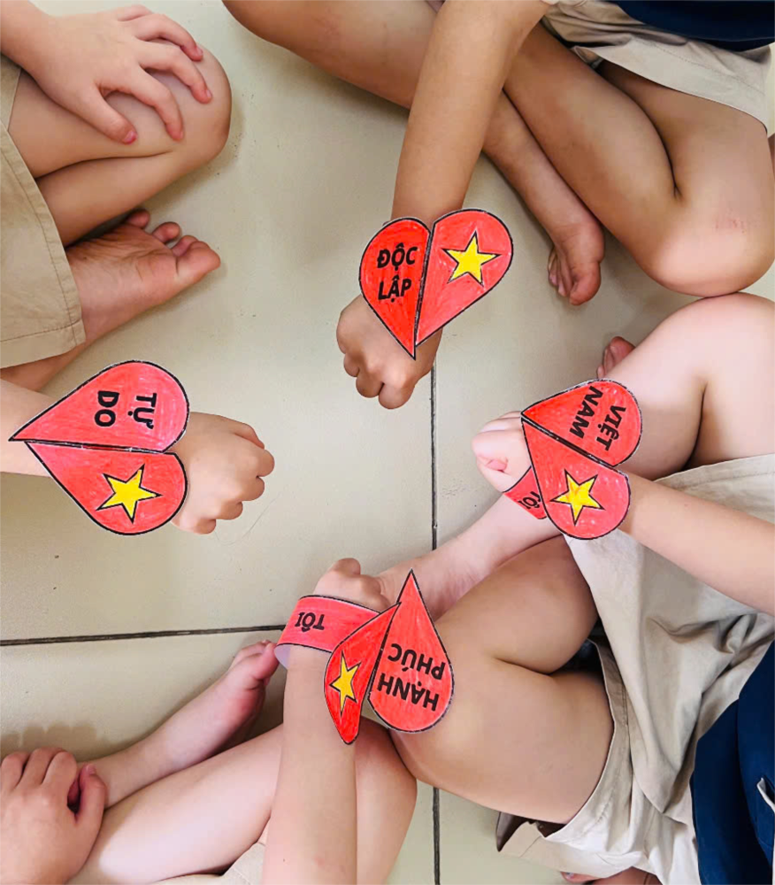 Dưới sự hướng dẫn tận tình của cô giáo, các bé đã khéo léo lựa chọn những nguyên vật liệu phù hợp để tạo nên những chiếc vòng tay xinh xắn, mang sắc màu tươi vui, rực rỡ. Dù đôi tay còn vụng về, nhưng mỗi sản phẩm đều chứa đựng tình cảm trong sáng, hồn nhiên và niềm vui của trẻ thơ trong dịp lễ trọng đại của đất nước.