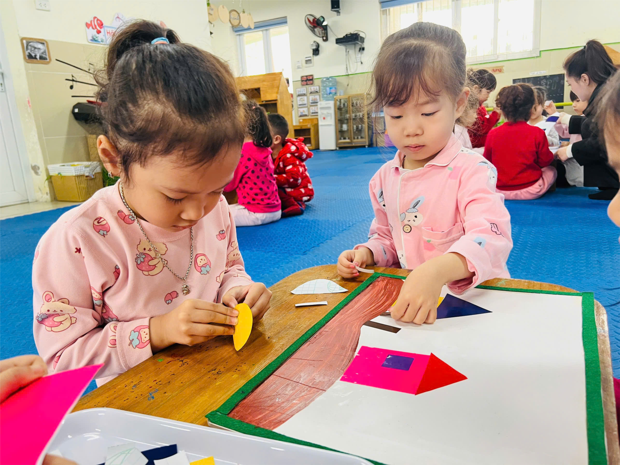 Mỗi em được phát một bộ hình với những mảnh ghép đơn giản, từ các hình khối cơ bản như hình vuông, tam giác, hình tròn. Bằng sự sáng tạo và khả năng quan sát, các em đã chắp nối các mảnh hình sao cho phù hợp, tạo ra những bức tranh đầy màu sắc và độc đáo.