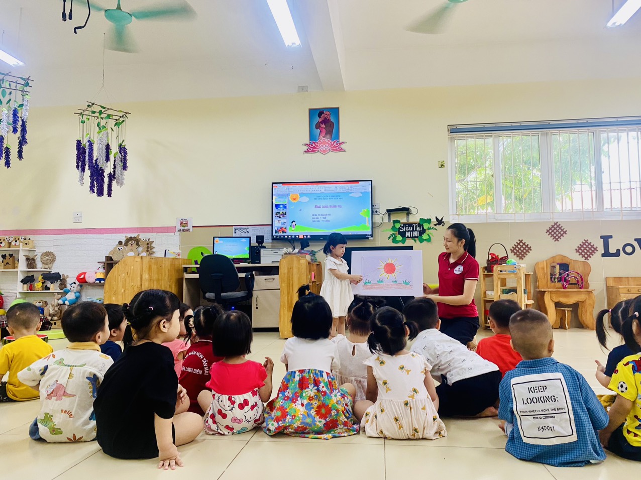 Khi bắt đầu tiết học, cô Hồng đã nhẹ nhàng giới thiệu về hình dáng của ông mặt trời - một hình tròn lớn với những tia nắng rực rỡ xung quanh. Cô cũng đã khéo léo giải thích cho các bé về ý nghĩa của mặt trời trong cuộc sống, rằng ông mặt trời mang đến ánh sáng, sự ấm áp và niềm vui mỗi ngày.