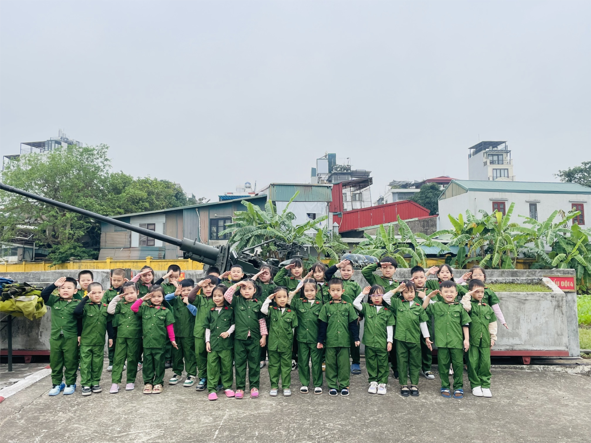Nhằm giúp trẻ hiểu hơn về hình ảnh và công việc của các chú bộ đội, đồng thời giáo dục lòng yêu nước và sự kính trọng đối với những người chiến sĩ, ngày 15/12, các bé lớp Mẫu Giáo Lớn A2 đã có chuyến tham quan doanh trại bộ đội vô cùng ý nghĩa và bổ ích. Trong chuyến đi, các bé được các chú bộ đội nhiệt tình đón tiếp, hướng dẫn tham quan khuôn viên doanh trại, nơi ở, nơi sinh hoạt và làm việc hằng ngày. Trẻ tỏ ra rất hào hứng khi được tận mắt quan sát trang phục, đồ dùng của các chú bộ đội và lắng nghe những câu chuyện giản dị về cuộc sống trong quân ngũ.