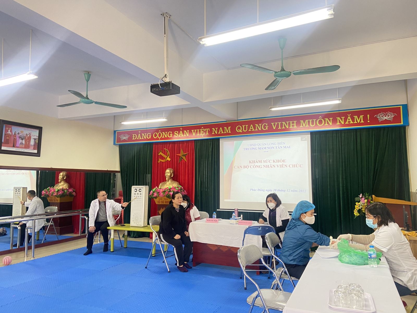 Công tác khám sức khỏe được đội ngũ bác sỹ thuộc trung tâm y tế quận Long Biên chuẩn bị chu đáo và thực hiện ngay tại trường nhằm tạo điều kiện thuận lợi cho cán bộ, giáo viên, nhân viên trong giảng dạy, công tác. Nhà trường đã lựa chọn gói khám tổng quát, đầy đủ và cần thiết như: siêu âm, khám thể lực, khám nội khoa, khám răng hàm mặt, da liễu, mắt, xét nghiệm 18 chỉ số máu, giúp cho các bác sỹ có đủ dữ liệu và tư vấn sức khỏe cho từng cán bộ, giáo viên, nhân viên.
