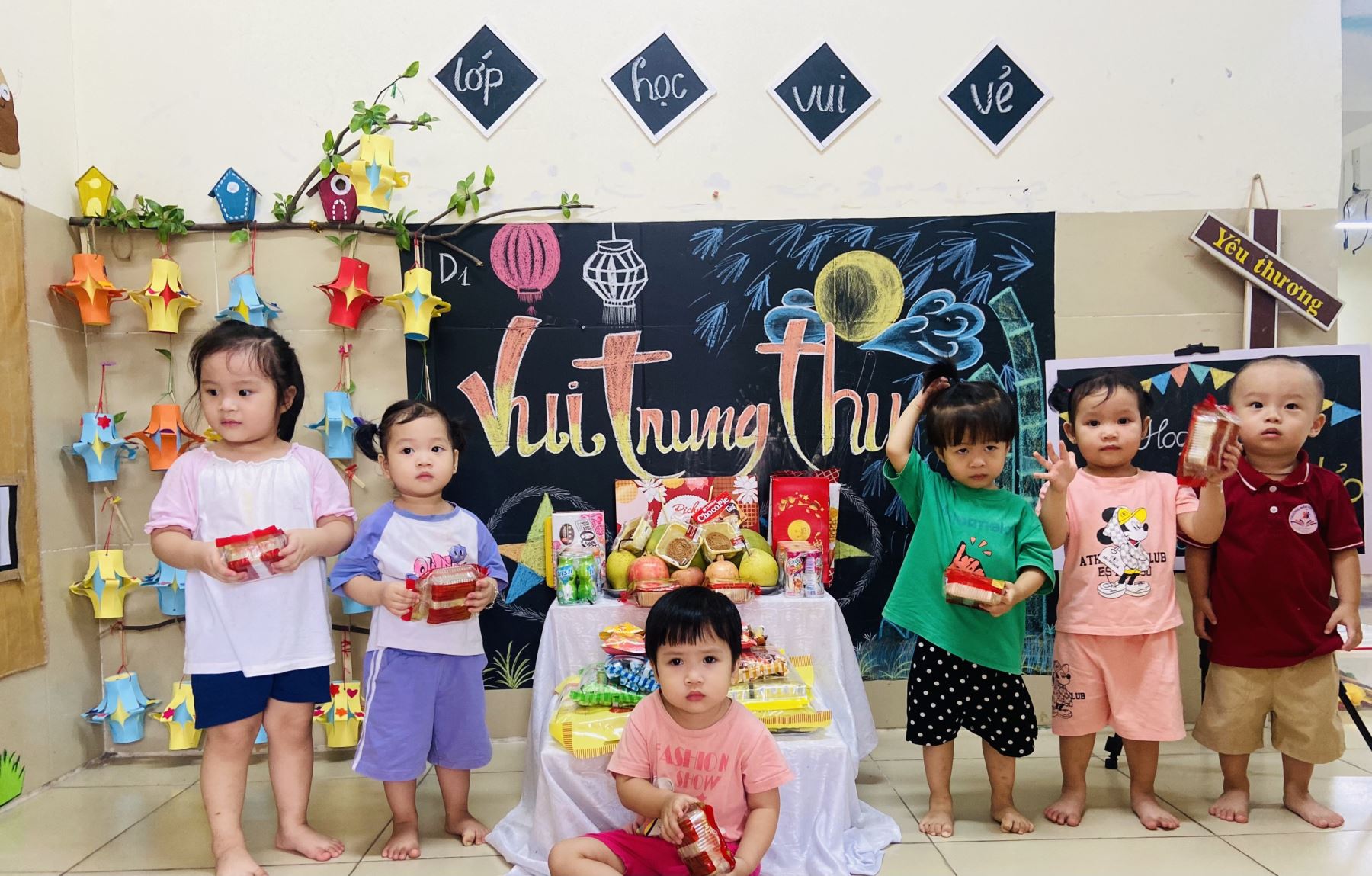 Ngoài các hoạt động chung của trường tổ chức, ở trong lớp các bạn nhỏ D1 còn được các cô giáo tổ chức rất nhiều các hoạt động như : làm đèn lồng, làm bánh trung thu, mặt nạ...Các bé rất hào hứng khi dược cùng bày mâm ngũ quả và tham gia liên hoan phá cỗ trung thu tại lớp. Thật là một mùa trung thu vui vẻ và ý nghĩa với các bé lớp nhà trẻ D1,khi năm đầu tiên bước chân vào ngôi truòng mầm non.