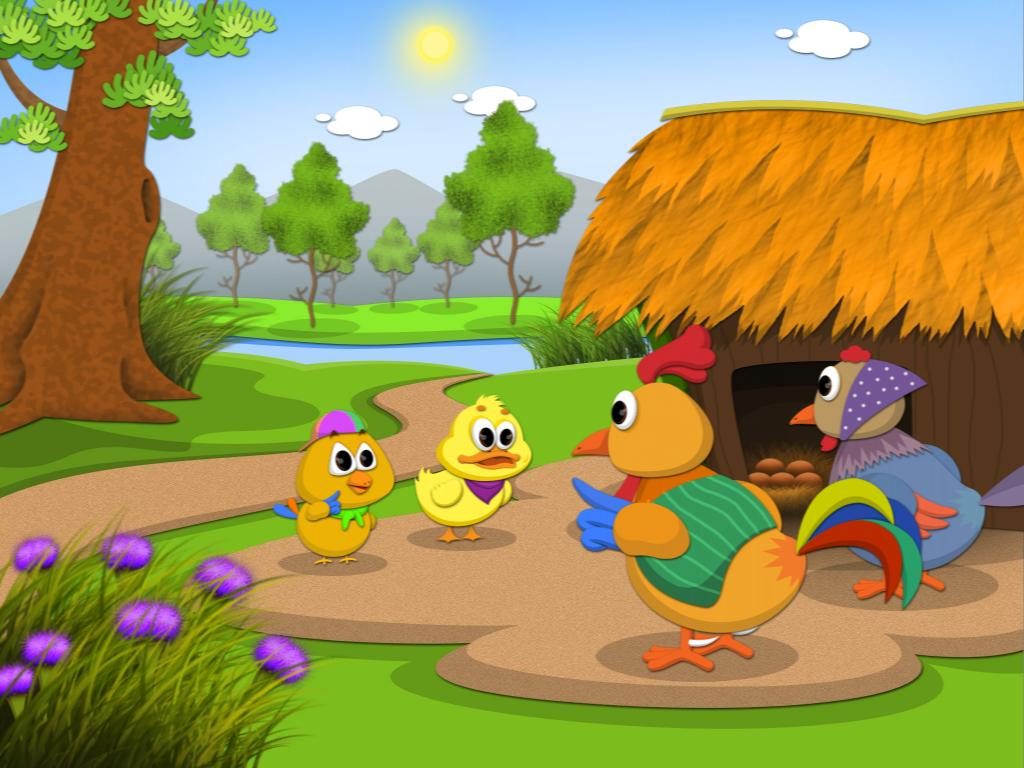 Vịt con thấy Gà con cỏo với mỡnh cũng buồn, liền bỏ ra ao tỡm tộp ăn. Một con Cáo mắt xanh, đuôi dài nấp trong bụi rậm, thấy Gà con đi tỡm mồi một mỡnh định nhảy ra vồ. Gà con sợ quá vội ba chân bốn cẳng chạy ra bờ ao. Gà con vừa chạy vừa kêu : “Chiếp, chiếp, chiếp !”.