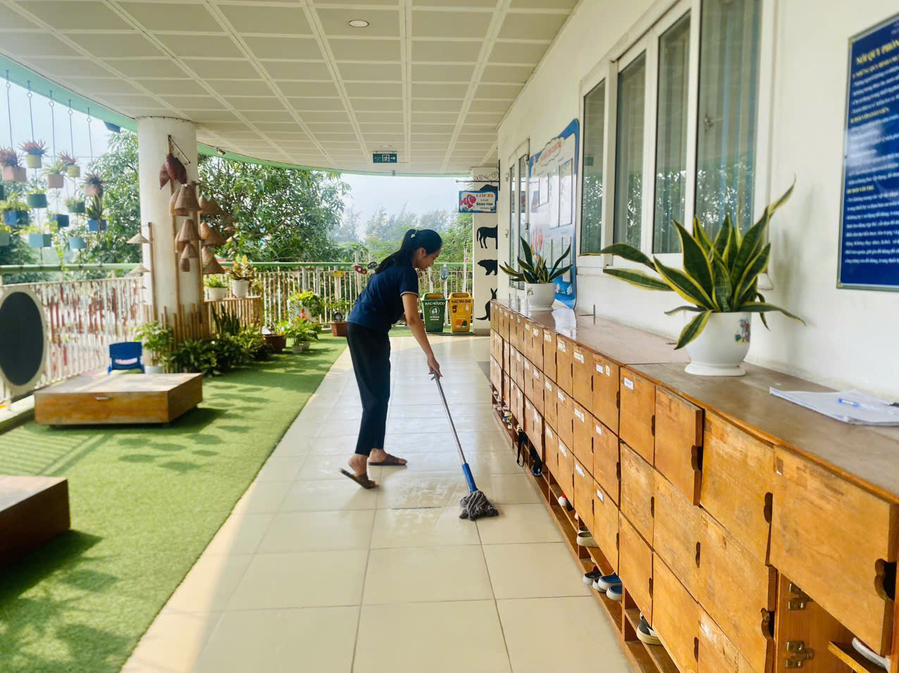 Dưới sự hướng dẫn tận tình của các cô giáo, những "chiến sĩ nhí" bé bỏng trở nên chăm chỉ và tự giác lạ thường: các bé trai hăng hái cùng cô rửa sạch những món đồ chơi yêu thích, trong khi các bé gái tỉ mẩn lau chùi từng chiếc bàn, chiếc ghế, sắp xếp sách vở về đúng vị trí. Những đôi tay nhỏ xíu, dù còn vụng về nhưng tràn đầy nhiệt huyết, đã góp phần làm cho không gian lớp học trở nên sáng sủa, thơm tho và ngăn nắp hơn bao giờ hết, sẵn sàng chào đón một tuần học mới an toàn và tràn đầy niềm vui. Hoạt động này không chỉ đơn thuần là giữ gìn vệ sinh, mà còn là bài học thực tế quý giá về tinh thần trách nhiệm, thói quen gọn gàng và tình yêu thương với "ngôi nhà thứ hai" của mình, gieo vào tâm hồn trẻ thơ hạt mầm của một lối sống xanh, sạch, đẹp ngay từ những điều nhỏ nhất.