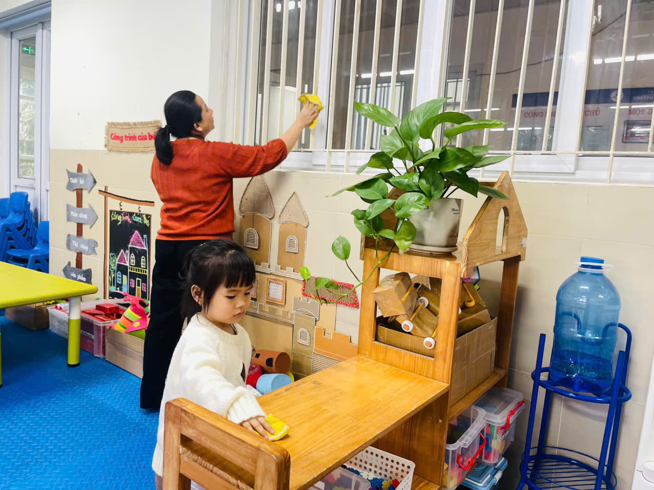 Ngay từ đầu buổi, các cô giáo đã phân công nhiệm vụ cụ thể cho từng nhóm. Bên trong lớp học, bàn ghế, đồ dùng học tập, giá đồ chơi được lau chùi sạch sẽ, sắp xếp gọn gàng, ngăn nắp. Các góc học tập được làm mới, tạo không gian học tập thoáng mát, an toàn cho học sinh.