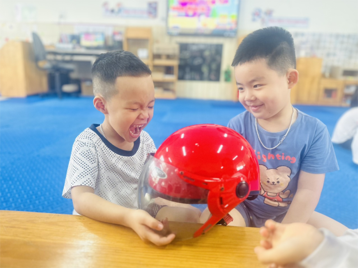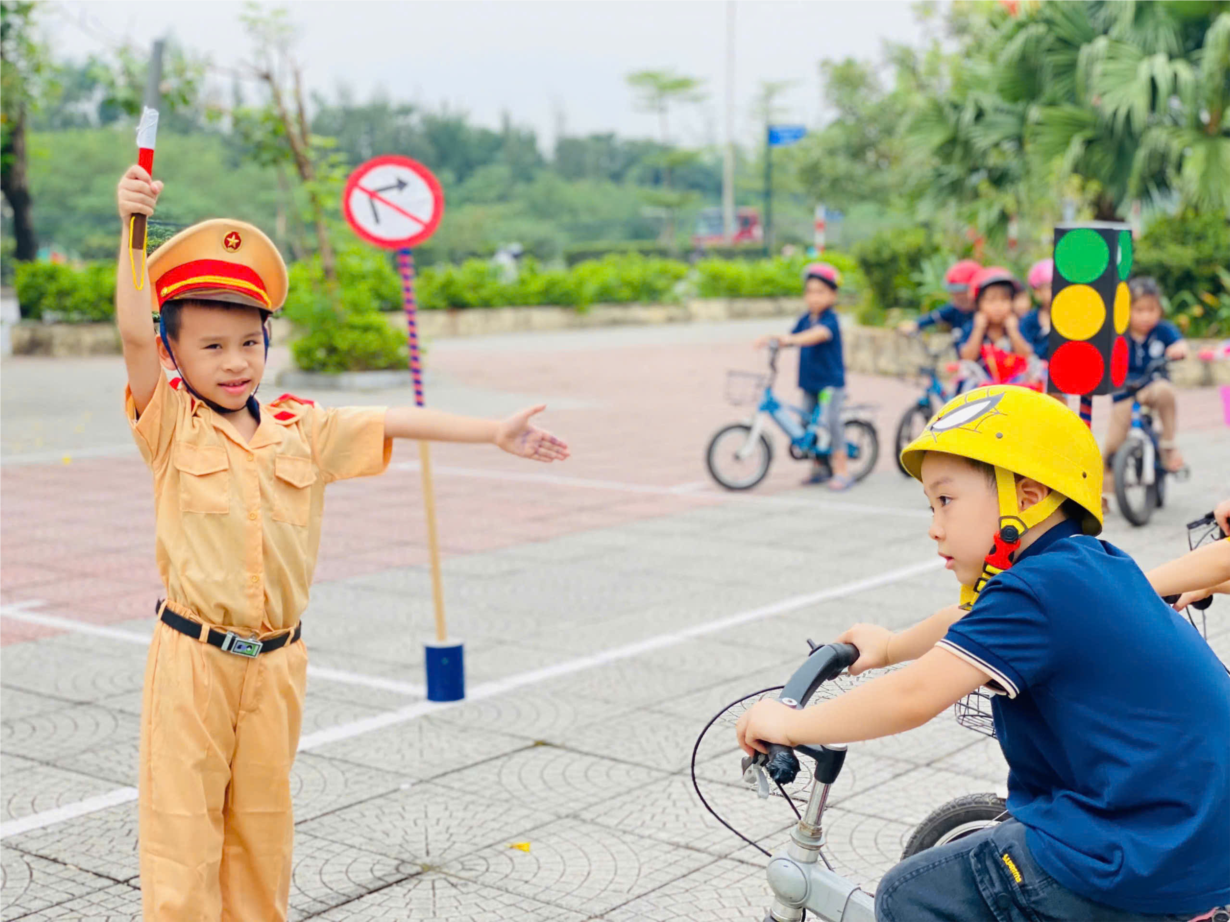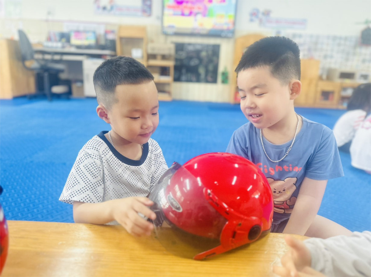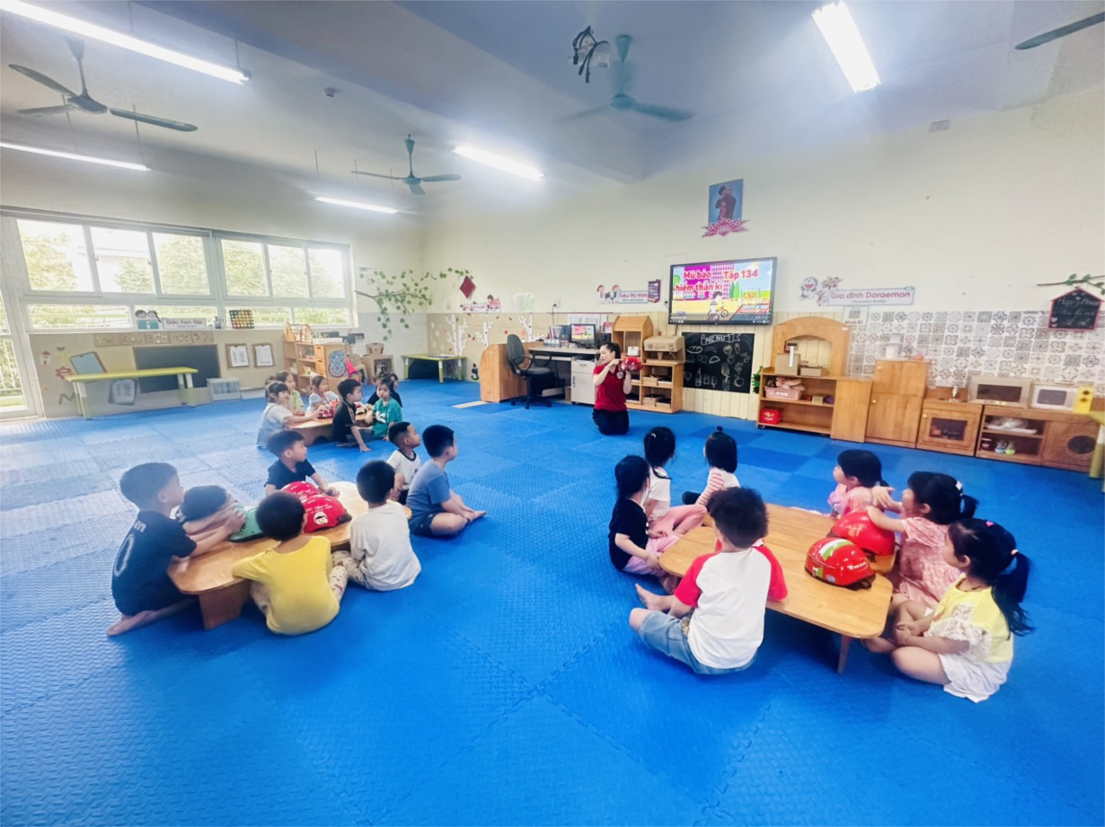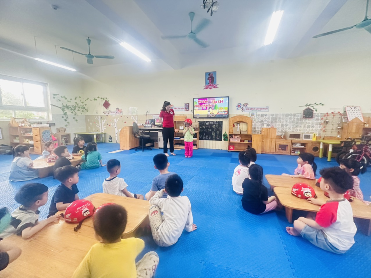 Các bé MGN B1 thực hành đội mũ bảo hiểm