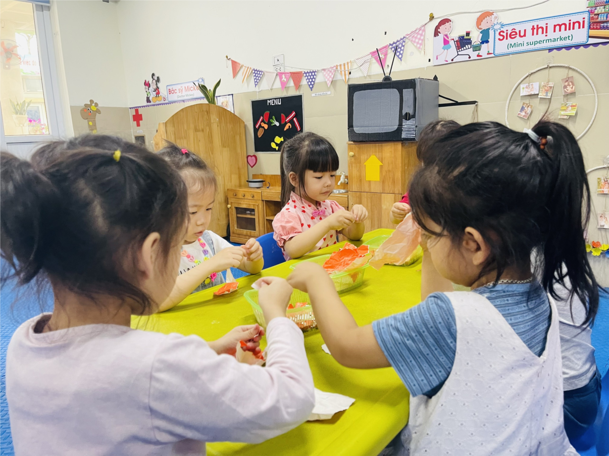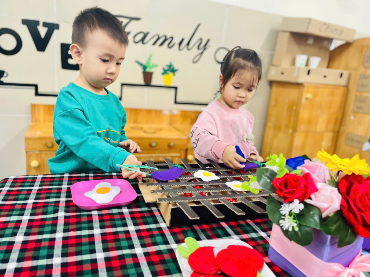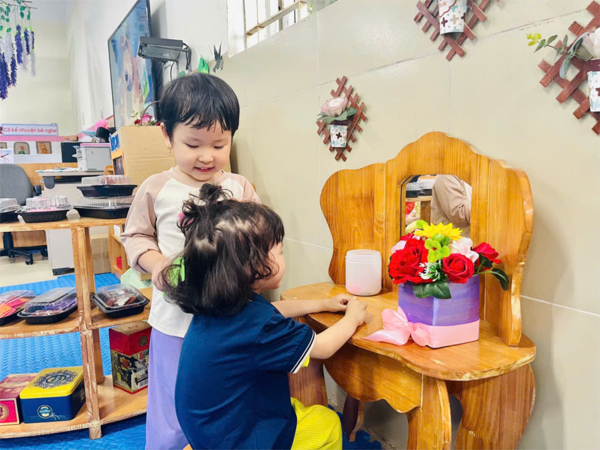Các bé Nhà trẻ D1 hào hứng tham gia hoạt động góc tại lớp.