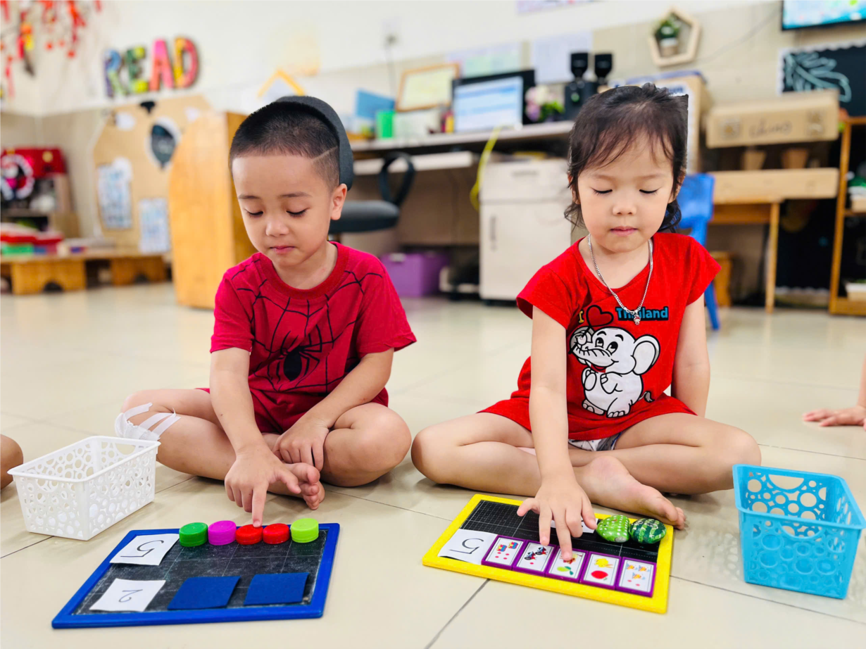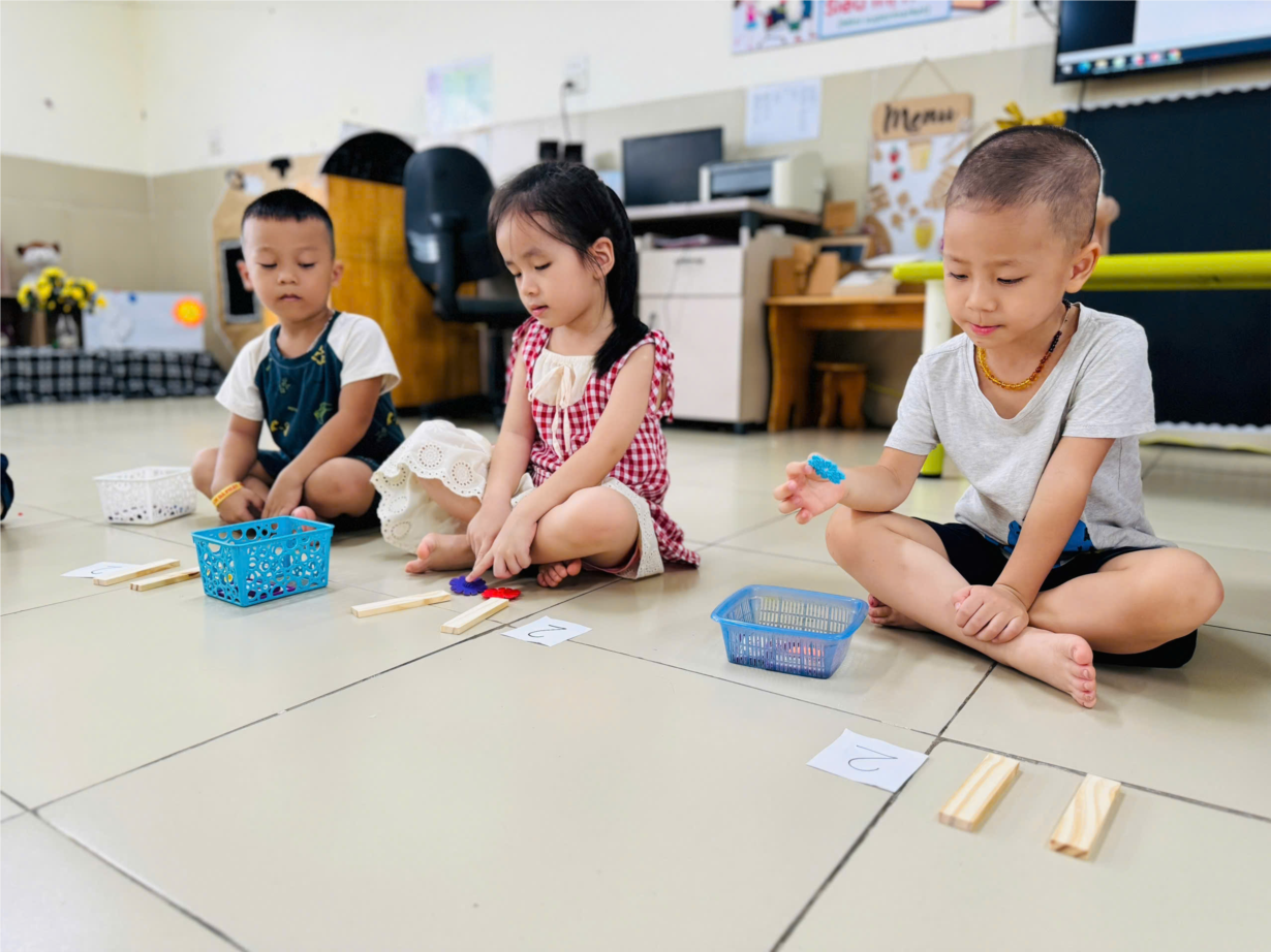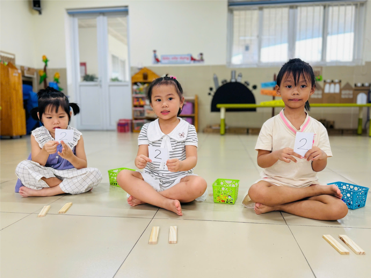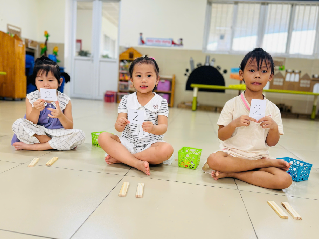Ảnh đẹp tháng 9 - Các bạn nhỏ MGN B2 thích thú với giờ học toán: Đếm đến 2 - nhận biết số lượng và chữ số 1,2