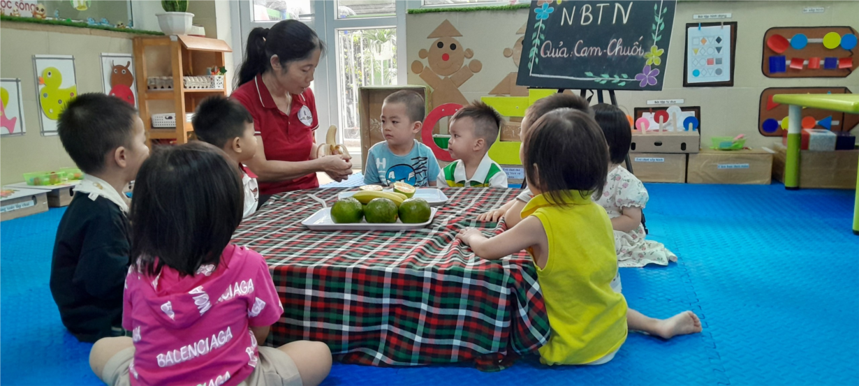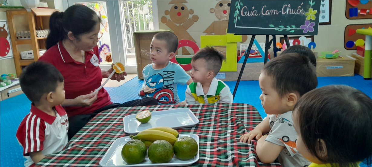 Các bé nhà trẻ D2 vơi shoatj đông nhận biết tập nói: Quả cam - quả chuối