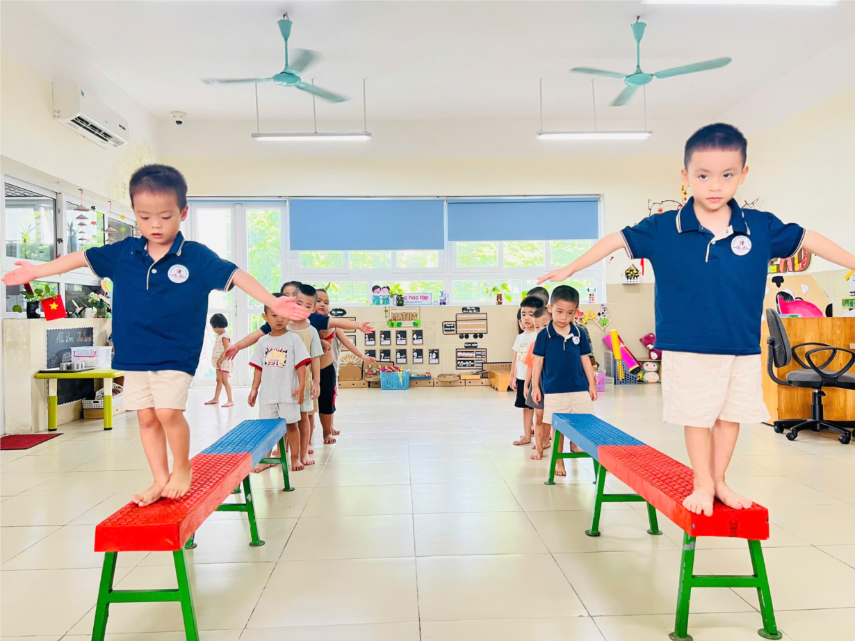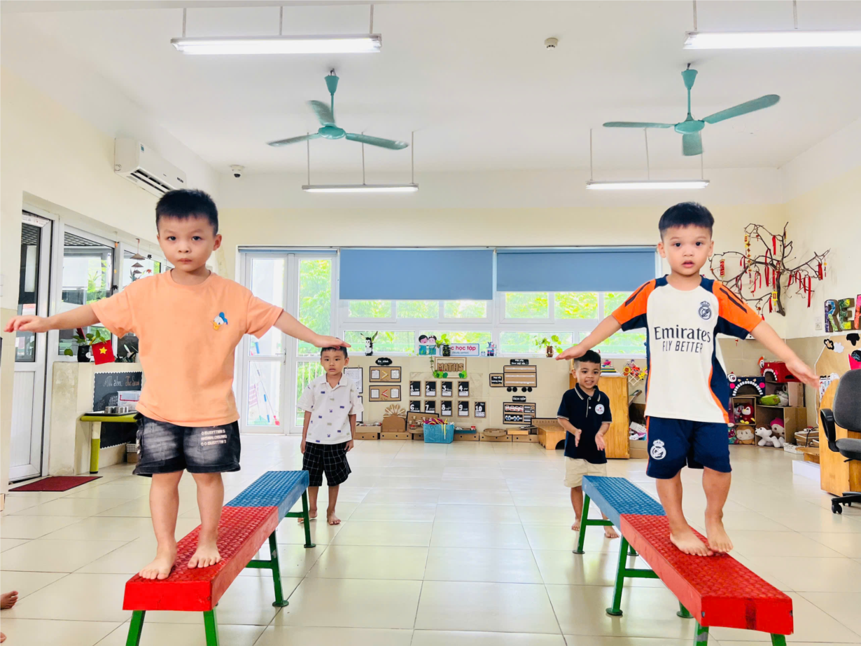 Ảnh đẹp tháng 9 - Các bé MGN B2 thích thú tham gia hoạt động thể chất: Đi trên ghế thể dục
